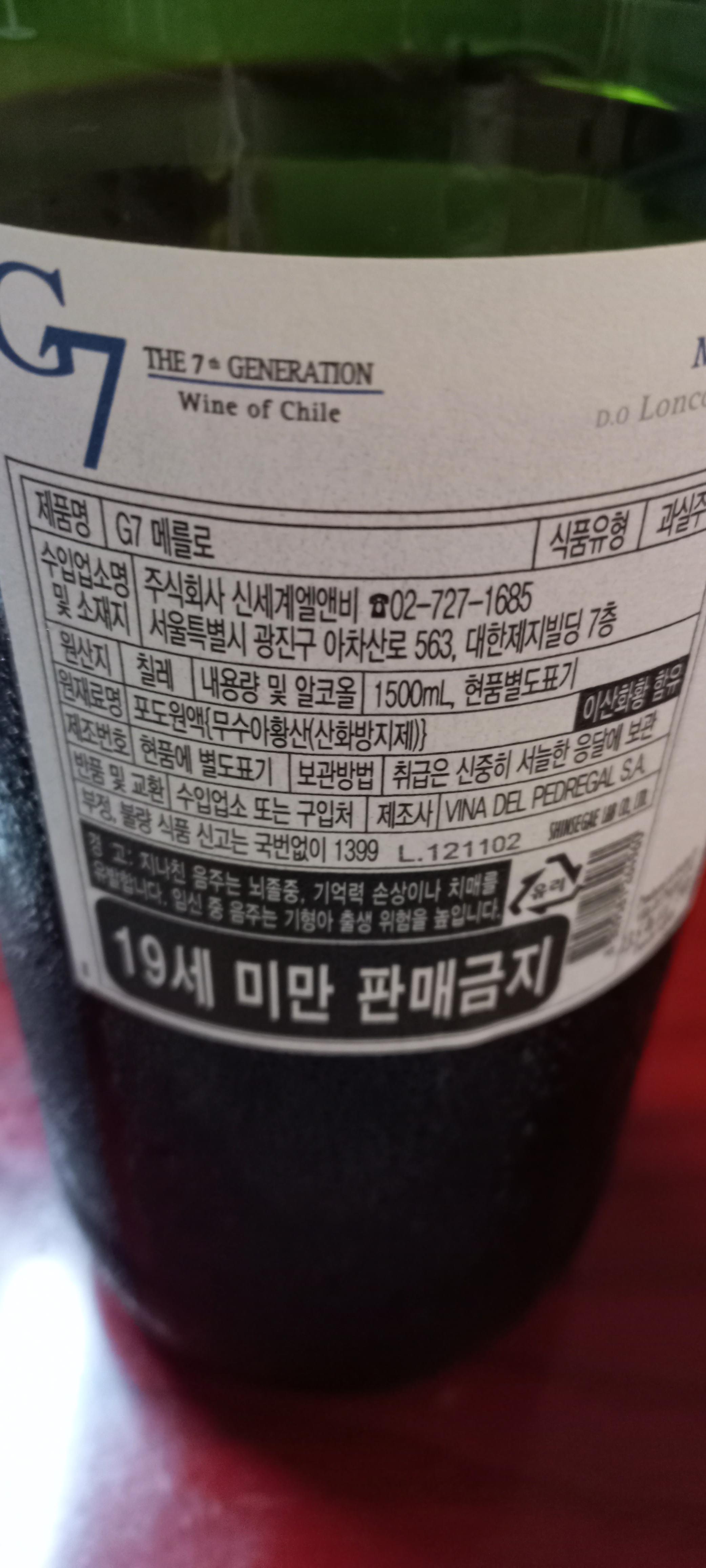 칠레산 와인 중 가성비 와인 중 하나로 꼽히는 G7. 포도 품종에 따라 2가지로 나뉘어지는데 그날 그날 분위기에 따라 까베르네 소비뇽으로 갈 것인지, 아니면 메를로로 갈 것인지가 정해지는데, 본인은 개인적으로 전자는 다소 바디감이 중후하고 강하게 다가오고, 후자는 다소 경쾌한 느낌이 있어서 말 그대로 그날 그날 기분에 따라 와인을 선택한다.