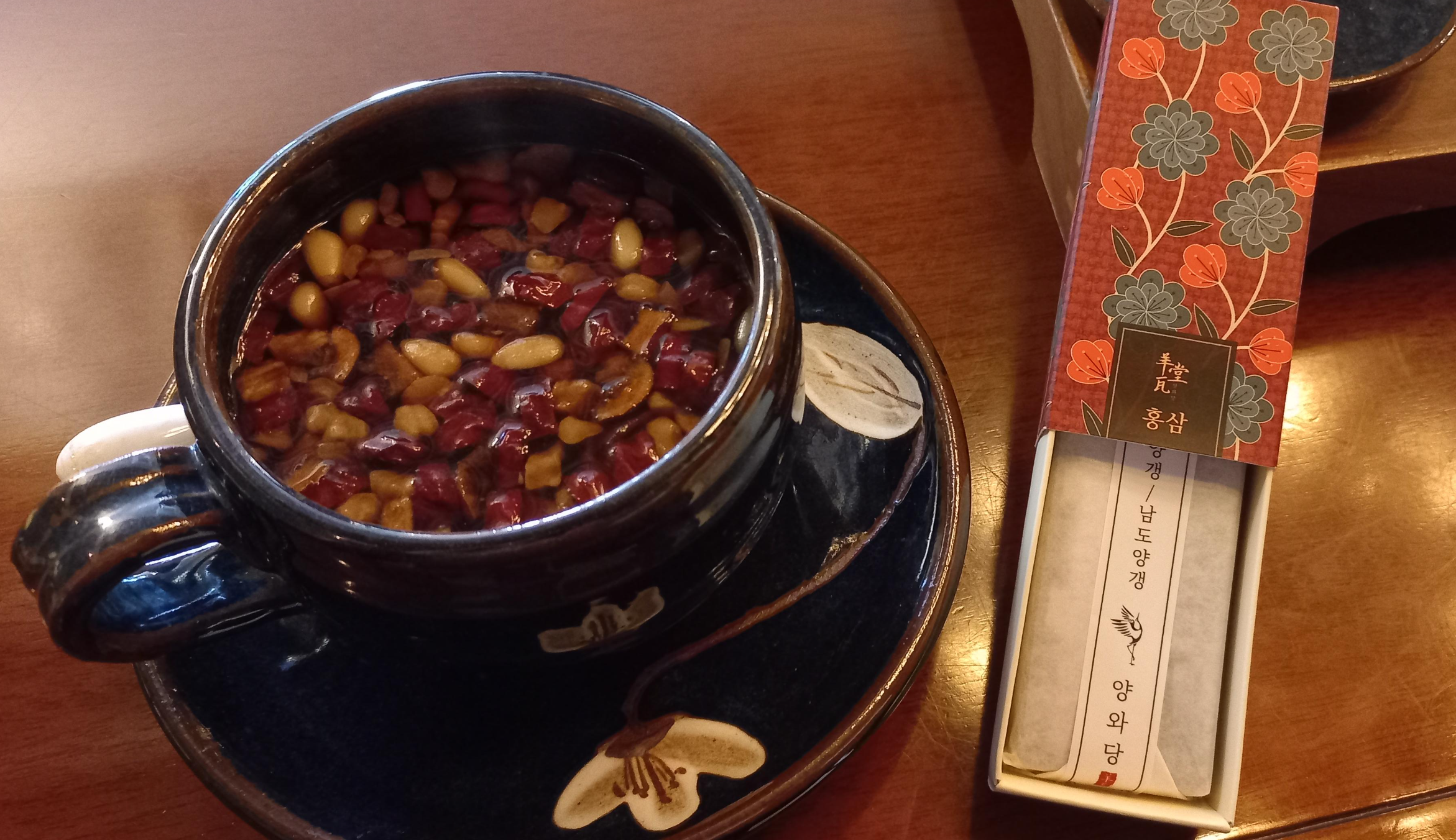 그래서 저는 쌍화차를 주문했습니다. 그리고 수제 남도양갱 몇 개를 낱개로 주문해서 맛을 봤습니다. 쌍화차는 아주 맛있었고 홍삼으로 만든 양갱은 건강이 좋아지는 느낌을 주는 맛이었습니다.