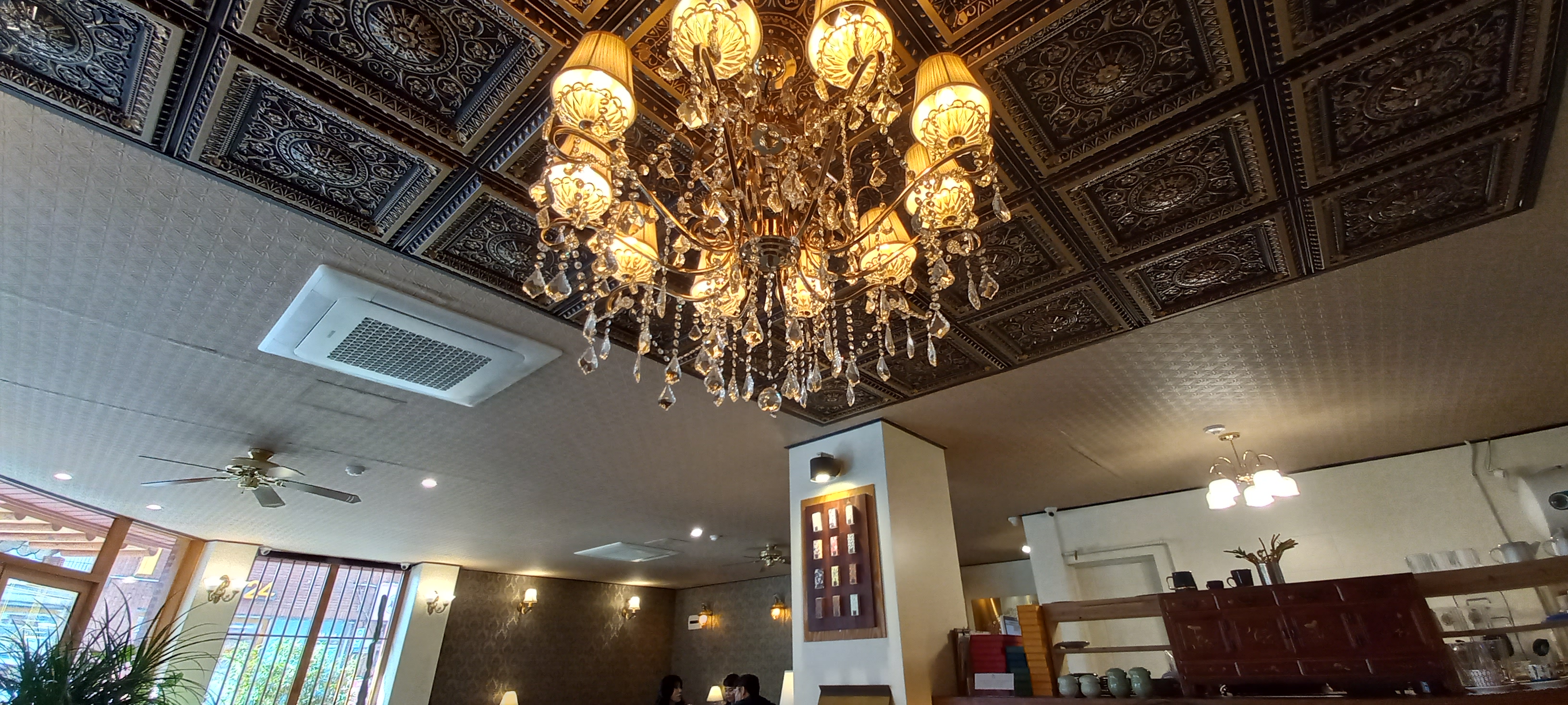 실내로 들어가면 천장에 붙어있는 샹들리에가 눈에 들어옵니다. 천장의 데코레이션도 그렇고 갑자기 타임머신을 타고 과거로 돌어온 것 같습니다.
