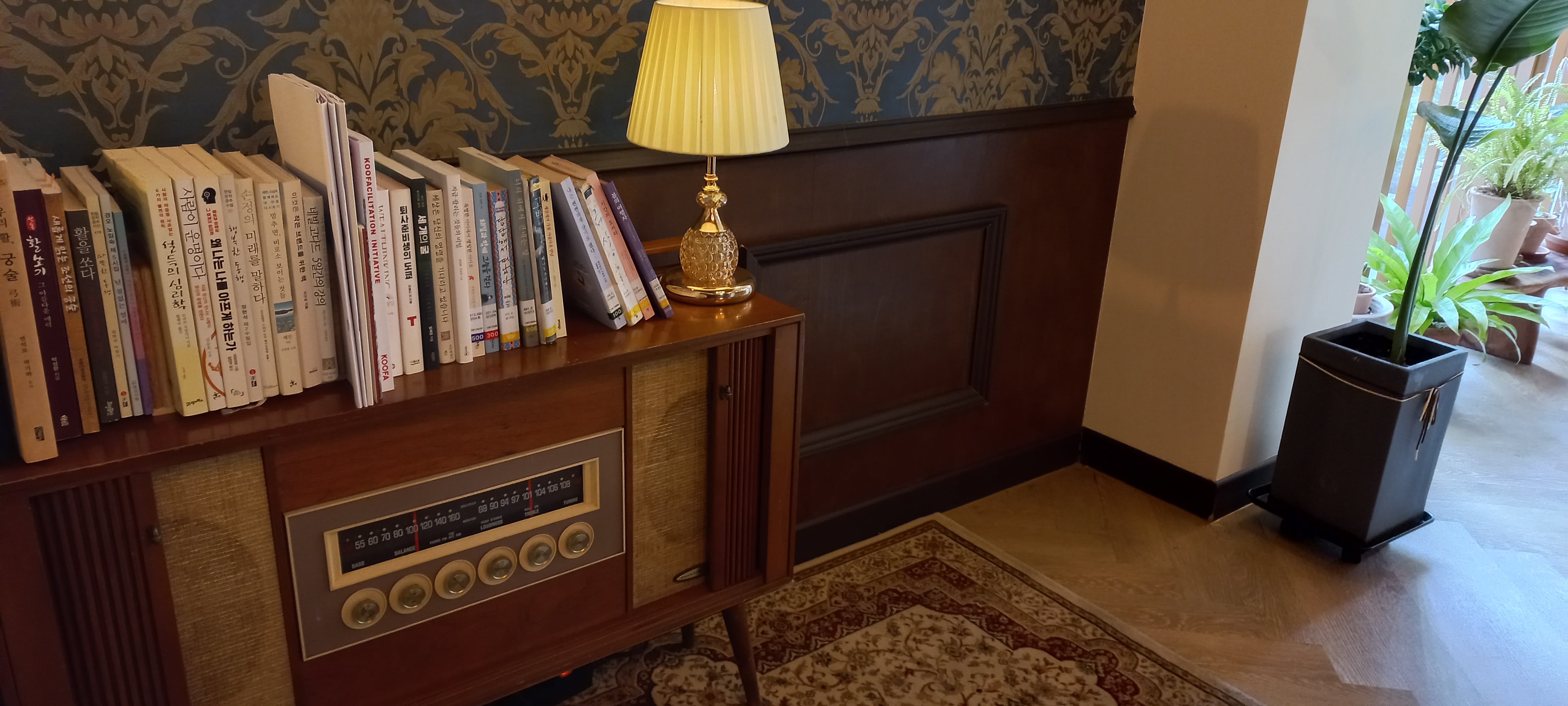 광양 중마동 양와당(처음에는 양화당인 줄 알았어요 ㅠ) 이색까페의 한 쪽 구석을 보니 레트로 분위기가 흠껏 느껴지네요. 지금은 쉽게 찾아볼 수 없는 거실 라디오와 앤틱스러운 램프, 그 위에 진열되 있는 다양한 책들.